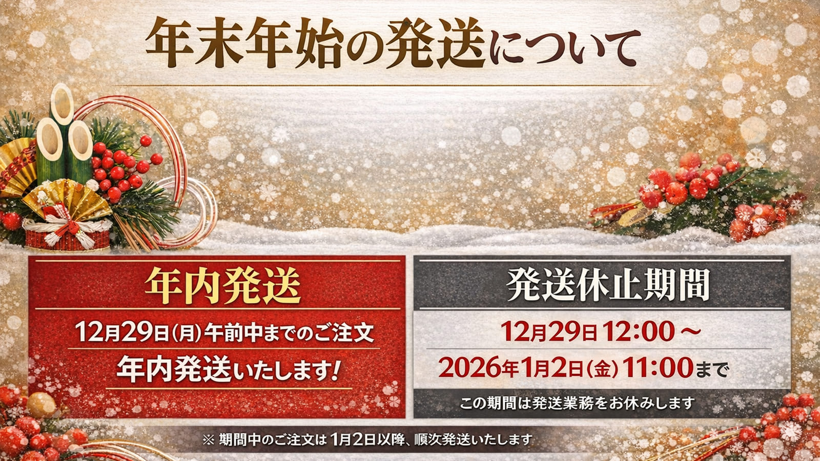 - 年末年始は配送業者の混雑により、到着までにお時間を要する場合がございます